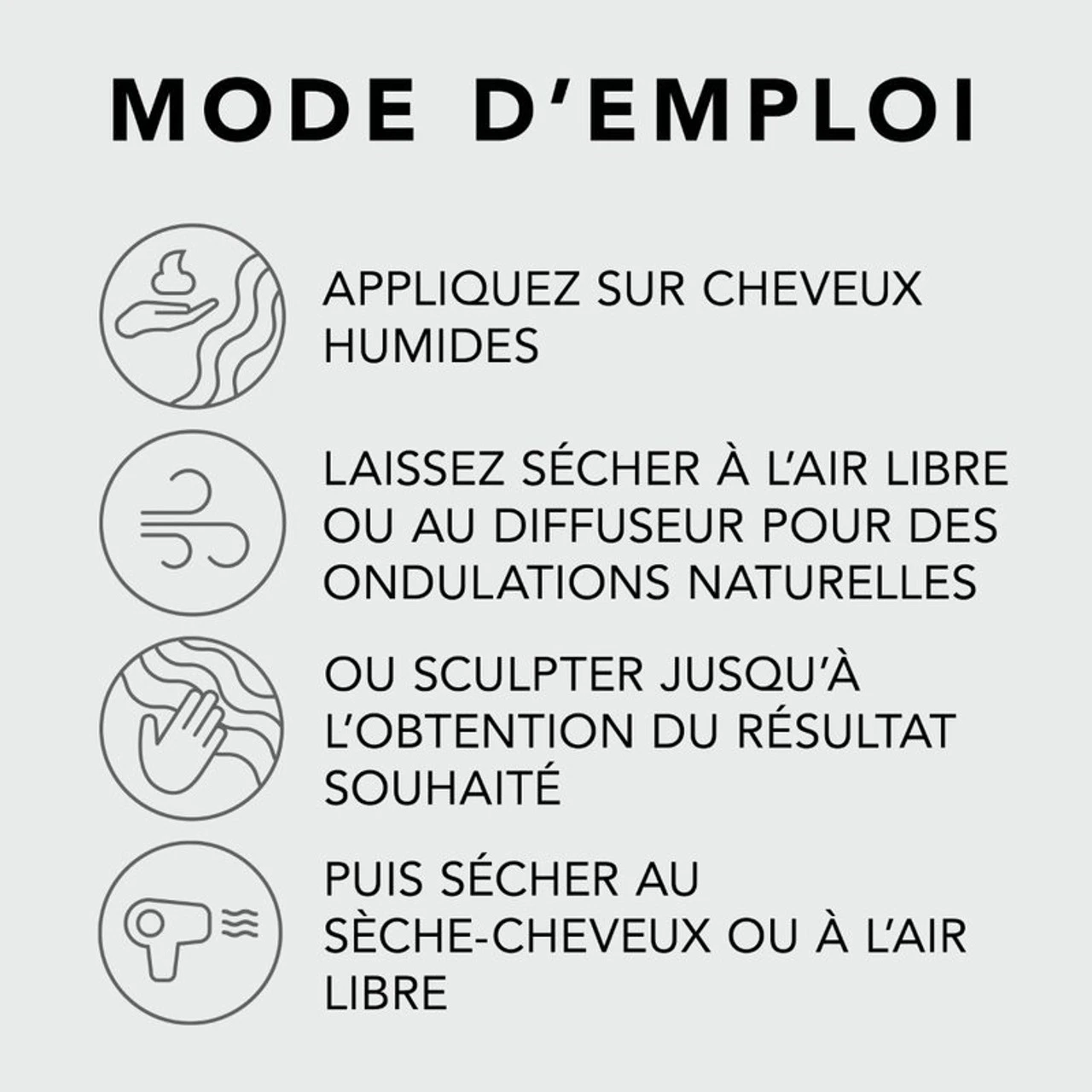 – SĂ©chez Ă l’air libre ou au sĂšche cheveux avec un diffuseur pour accentuer et dĂ©finir les boucles et les ondulations naturelles